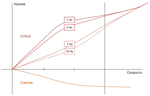 График иллюстрирует изменение жесткости отбоя амортизатора FSD в зависимости от частоты хода штока: