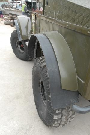 Колеса: резину поставили фирмы Super Swamper IROK размером 39,5х13,5 дюймов. Выбор именно этого типа резины был обусловлен необходимостью частой езды машины по верховым болотам, которые встречаются на севере России. Мягкость и гибкость резины очень хорошо подходит для такого грунта. Диски с большим отрицательным вылетом 35мм, проставки 30мм и бедлоки собственного производства.