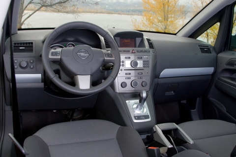 Салон Zafira дает понять, что пассажирам и водителю здесь должно быть, прежде всего, удобно и комфортно, а вот радовать глаз здесь тоже нечем. Все на месте, приборная панель, руль и магнитола выполнены в чисто опелевских традициях, если у тебя во владении уже был один из представителей последнего поколения этой марки, то даже привыкать не придется. А вот, только что пересевшим за руль Opel с другого авто, придется какое-то время понервничать из-за нефиксируемых переключателей поворотов, света и стеклоочистителей, а также запутанной системы климат-контроля. В остальном, к салону Zafira нет никаких претензий. Мягкий пластик торпедо, невзрачная, но качественная обивка сидений, множество кармашков для мелочевки, подстаканники, рычаг стояночного тормоза причудливой формы – все на уровне.